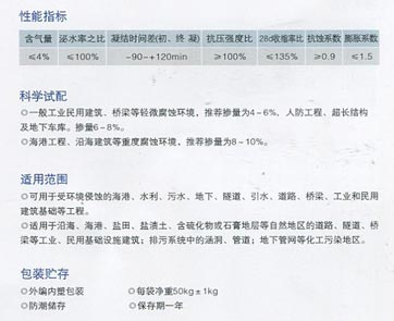 cal 防腐阻繡抗裂防水劑是新一代的趕緊混凝土復(fù)合型外加劑。本產(chǎn)品具有混凝土抗裂防水劑的性能外,更能**抵抗硫酸根離子侵蝕,阻止和延緩混凝土中鋼筋繡蛀的功能,從根本上解決了傳統(tǒng)混凝土結(jié)構(gòu)的諸多不足和局限性,可以使混凝土具有抗鹽類離子侵蝕,抗凍融循環(huán)破壞及高抗?jié)B透等良好性能。在硅酸鹽類水泥醬砂漿或混凝土中摻和本產(chǎn)品,能抵抗環(huán)境中一定濃度的SO24-.CI-,HC03-,CO2,NH4-,MG2+以及其鹽類、泛酸類的地下水,地表水,海水,污水和含鹽土壤,可容巖鹽等侵蝕物質(zhì)對砂漿或混凝土的侵蝕。本品的各種組分與混凝土的中的鈣,鎂等離子發(fā)生化學(xué)反應(yīng),生成堅硬和結(jié)晶物質(zhì),瞌減少混凝土中的凝膠空隙,在三維空間形成一個網(wǎng)絡(luò)結(jié)構(gòu),似的水泥中凝膠結(jié)構(gòu)增大增強,使混凝土中的各成分因話為一個密實的整體,封堵了混凝土的毛孔,增加了混凝土的密度,防止腐蝕性液體的向混凝土內(nèi)部侵蝕。鋼筋阻繡阻分會聚焦在鋼筋周圍形成一層保護層,防止鋼筋發(fā)生電化學(xué)腐蝕,增強混凝土在腐蝕、增強混凝土在腐蝕環(huán)境中的耐久性。